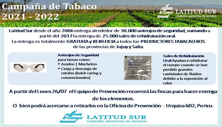 En esta edición de campaña tabaco 21-22, continuará con las entregas del elemento de protección, sumamente recomendado para tareas como azadeo, macheteo, carga y descarga de estufas; y de las sales de rehidratación ya que los trabajadores están expuestos al calor.